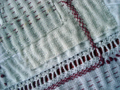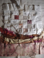 Ich suche mir zusammenpasende Teile aus und nähe Streifen, Quadrate, oder Rechtecke zusammen. Auch kombiniere ich miteinander und ergänze mit Fehlendem, schneide hier und da ein Stückchen ab oder ergänze mit einem anderen, größeren Teilchen. So entsteht eine unregelmäßige Fläche. Je nachdem was ich bezwecke entstehen so Quadrate, die ich dann später wieder kombiniere, neu anordne und zusammensetze. Manchmal bearbeite ich diese Quadrate auch einzeln vor dem Zusammennähen mit Zierstichen oder in der Technik des "Boro", Flickwerk aus Japan. Der Faden mit dem ich die Teile zusammennähe ist manchmal rot, blau oder weiß.