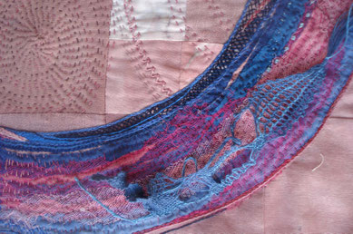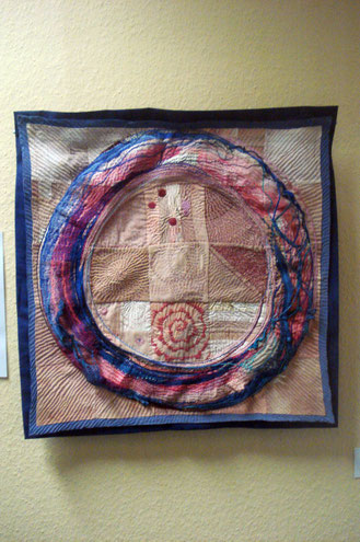 "Rund" ist 50 x 50 cm groß. Hintergrund : ecogefärbte Stoffe. handgequiltet. Handbestickt und mit eingeklöppelten plastischen Motiven. Der Kreis ist von hinten unregelmäßig mit Fasern gefüllt.