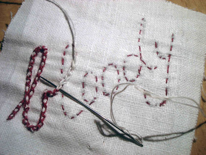 Für die Schrift benutze ich verschiedene einfache Stiche. Mit Kreidestift schreibe ich die Namen in meiner Handschrift vor, unregelmäßig. Dann nähe ich mit kleinen Vorstichen die Kontur und sticke dann mit Schling-oder Kettstich diese Kontur nach.